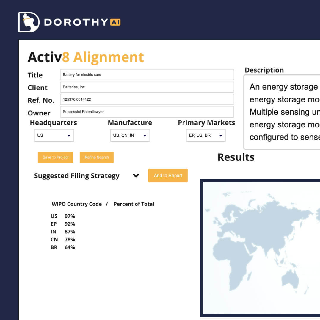 The “Jurisdictional Realities Database” powered by DorothyAI sets Activ8 Alignment apart from competitors. This database considers 30+ factors for each jurisdiction, enabling us to formulate filing and protection strategies informed by nuanced insights into innovation ecosystems, government policies, and judicial systems, giving you a competitive edge in global markets.